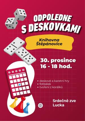 Srdečně zveme na "odpoledne s deskovkami". Datum konání: 30.12.2025 Místo konání: knihovna Veškeré informace na přiloženém plakátku.