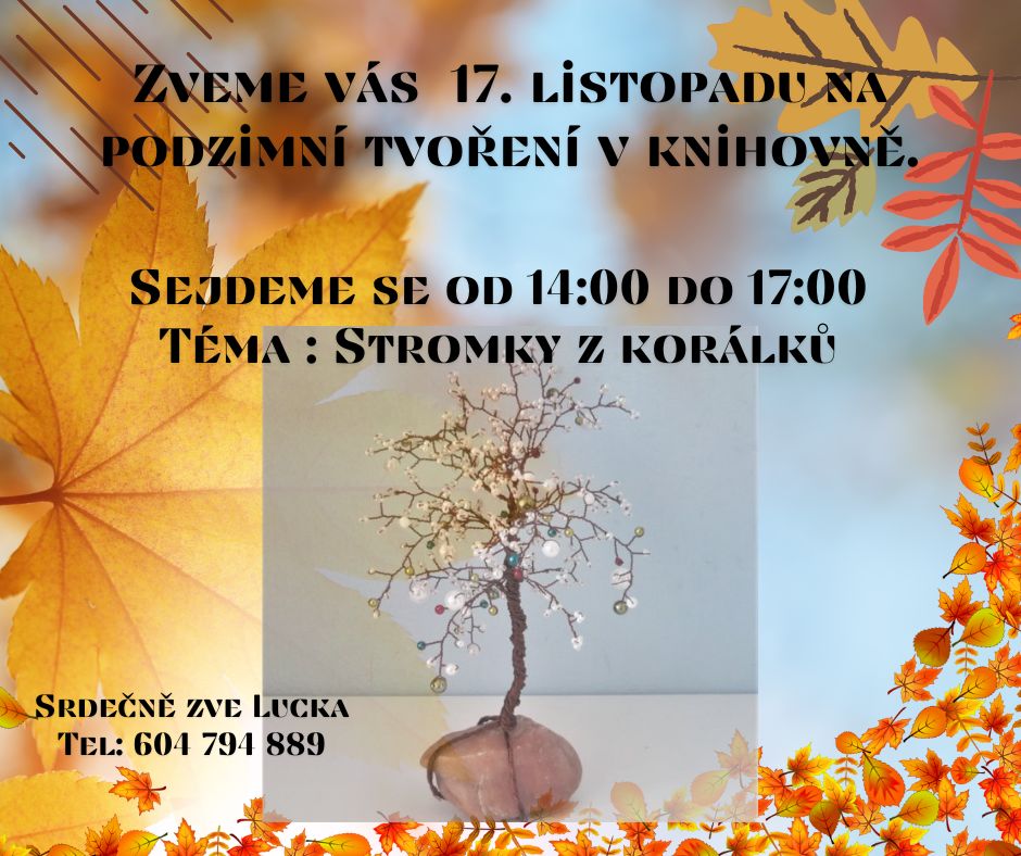 Srdečně zveme na "podzimní tvoření v knihovně". Datum konání: 17.11.2025 Veškeré informace na přiloženém plakátku.